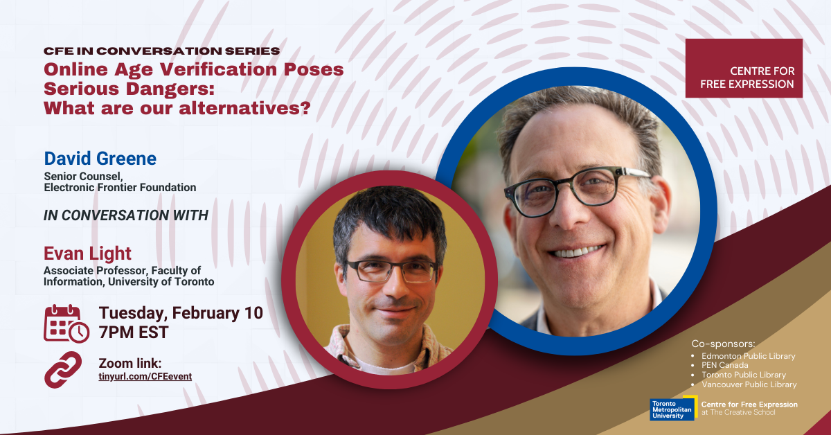 Hey folks - for those curious about all this age assurance/verification brew-haha, please tune in on Zoom tomorrow. Hosted by TMU's Centre for Free Expression, I'll be in conversation with David Greene, senior counsel at the Electronic Frontier Foundation.